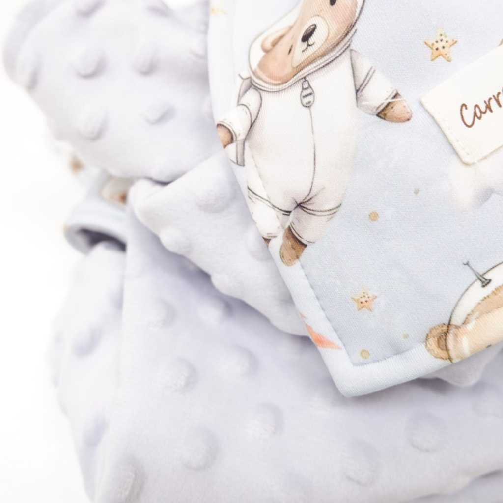 Selimut anak ukuran 100cm X 150cm dengan 2 sisi yang bisa digunakan bolak balik. 1 sisi bergambar dan 1 sisi berbulu dengan tekstur dot (minky).